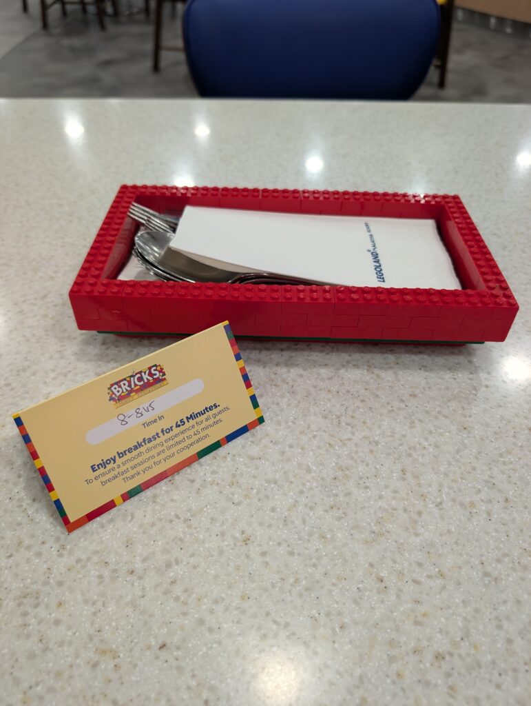ルームナンバーを伝えて席に案内されます。カトラリーケースもレゴ(笑)