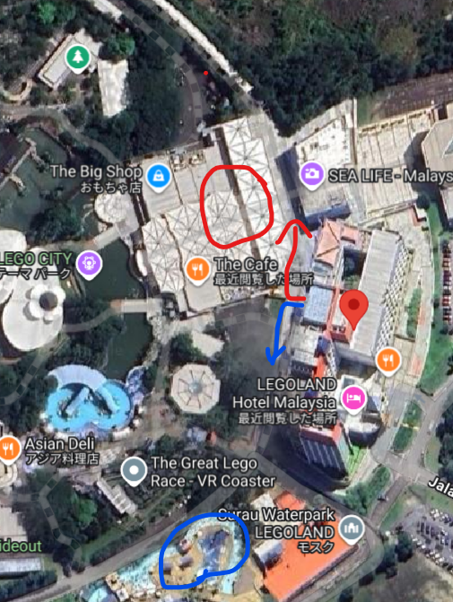 赤ルートがレゴランド。青ルートがウォーターパークです